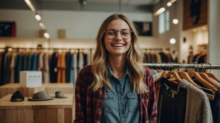 Smiling young woman in a clothing store enjoying a shopping experience on a sunny day