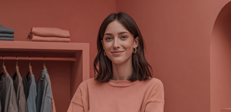 A woman smiles while posing in a clothing store. She stands in front of the shelves with clothes. The walls are painted pink, creating a warm atmosphere.