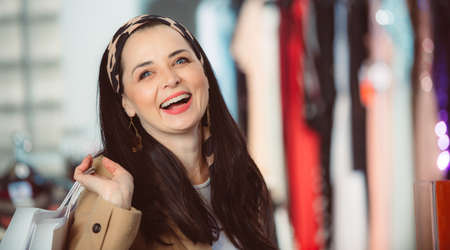 Portrait of happy woman shopping clothes in a store. Shopping people sale fashion concept