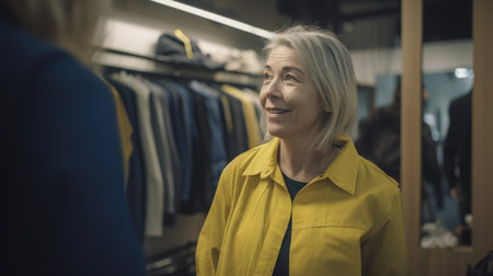 Salesperson Female Caucasian Mature Interacting with customer in store in Retail store. Generative AI AIG22.