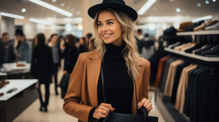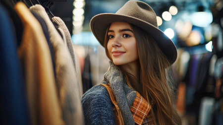 Stylish young caucasian woman in hat shopping for clothing in store. concept of fashion exploration, trendy accessories, retail therapy, modern lifestyle.