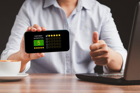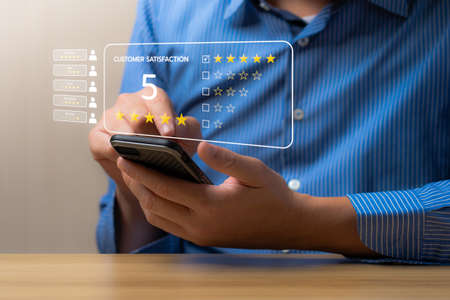 Customer satisfaction concept. Hands of a business man using a smartphone to comment 5 stars. Excellent business rating experience. Satisfaction Rating, good and impressive