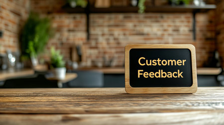 A wooden sign displaying Customer Feedback sits on a desk in a cozy caf้, amidst warm decor and greenery, inviting patrons to share their thoughts.