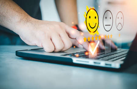 Customer use computer for service evaluation rating checkmark on smiling happy face icon three stars. The concept of client experience, feedback and satisfaction survey.