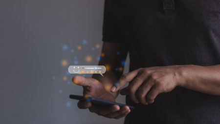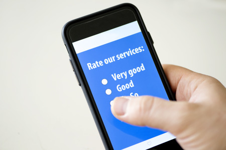 Man using a mobile phone in give rating to service experience on application. Online customer review satisfaction feedback survey and testimonial.