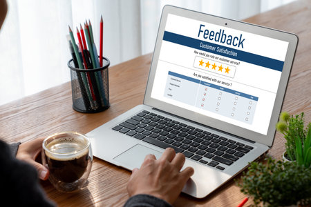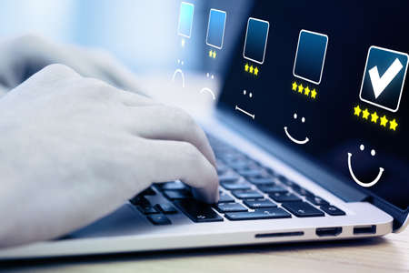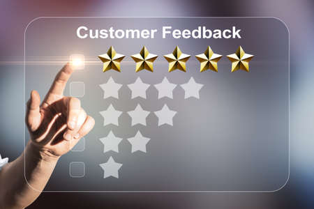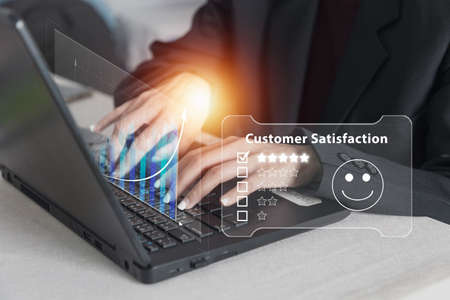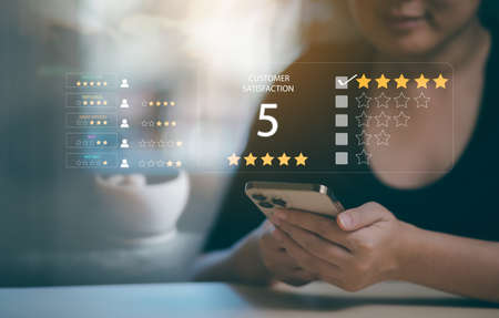 Customer review satisfaction feedback survey concept, User give rating to service experience on online application, Customer can evaluate quality of service leading to reputation ranking of business.