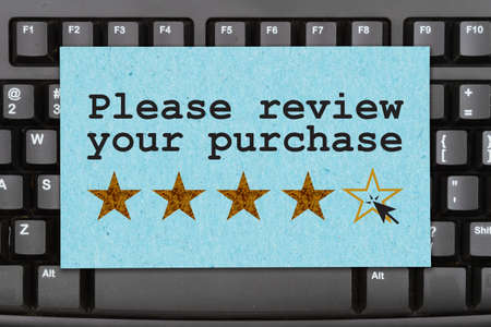 Please review your purchase message on blue card with 5 stars on a black keyboard
