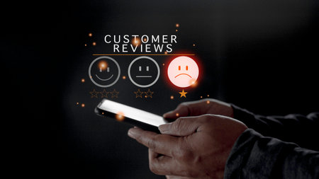 Customer review and feedback with one star on virtual screen. Assessment testimonial review for dislike service and low quality. Business concept of customer experience dissatisfied by smartphone.