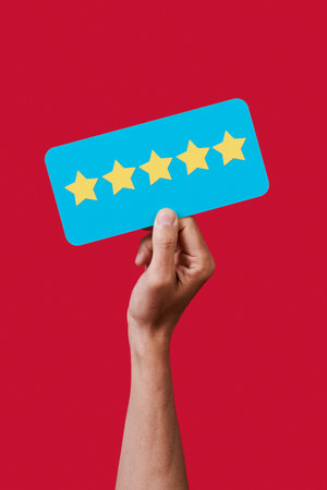 closeup of the hand of a man holding a blue sign with five stars, from a five star rating scale, on a red background