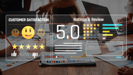 Visual representation of customer satisfaction metrics with ratings and reviews. Team members analyze performance data using charts and graphs in a collaborative workspace. Raster