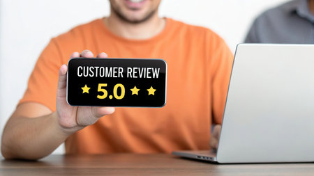 Customer reviews concept on smartphone screen with man using a laptop at the table