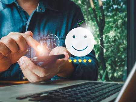 Customer service evaluation concept. Businessman pressing face smile emoticon show on virtual screen at smartphone.