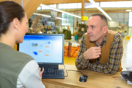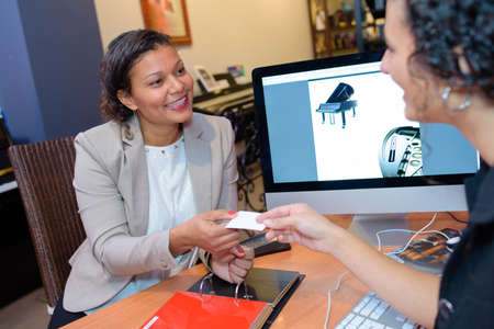 Young female client is handing the smiling salesman her credit card to pay for her art supplies in the store