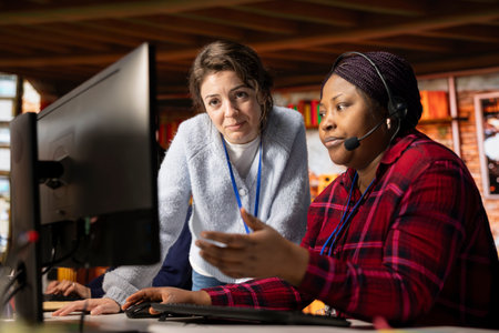 Call center supervisor providing support and guidance to intern, addressing questions. Customer support office onboarding specialist conducting orientation sessions for new agent using PC