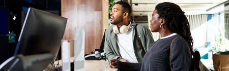 A couple excitedly checks into a hotel, looking forward to their vacation and new experiences ahead.