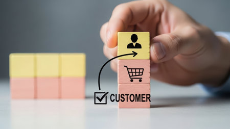 The image features a hand arranging a stack of wooden blocks. The blocks are colored yellow and pink. The top block has a symbol of a person, indicating a customer. An arrow points from the person symbol to a shopping cart icon on the middle block, symbolizing the customer journey. The bottom block has the word 'CUSTOMER' with a checkmark next to it. The image is set on a transparent background, making it suitable for various digital applications.