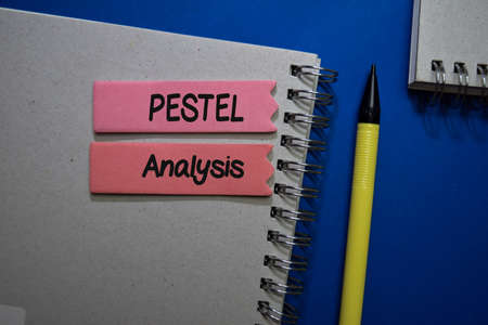 Pestel Analysis write on sticky note isolated on Office Desk.