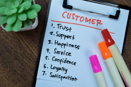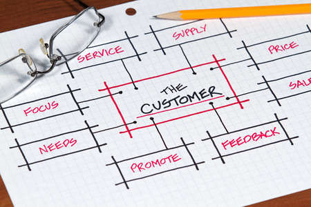 Concept of Customer write on paperwork with keywords isolated on Wooden Table.