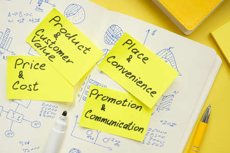Stickers with 4Cs and 4Ps of the marketing mix on the notebook.