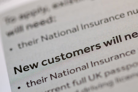 Close-up shot of a document with text focusing on the phrase New customers will need, surrounded by blurred text mentioning National Insurance numbers and UK passports. Predominantly grayscale with black text.