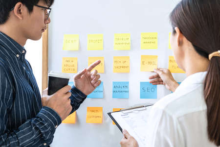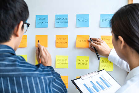 Two creative Business people meeting and planning use post notes sticky note on board to share idea, Analysis data charts and graph with teamwork strategy brainstorming.
