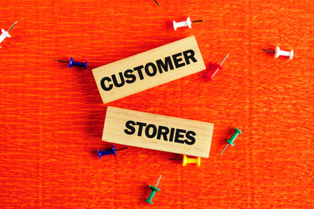 Business concept. Customer Stories words composition from wooden blocks, top view. Conceptual text