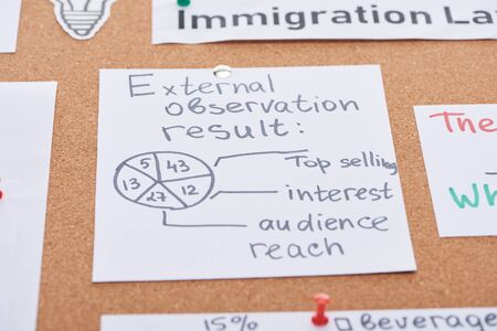 paper card with result notes and diagram pinned on cork office board