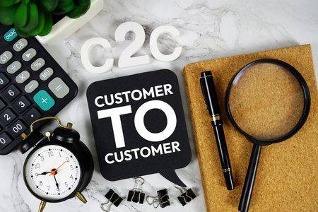 C2C - Customer to Customer acronym with calculator, alarm clock and magnifying glass, Business concept background
