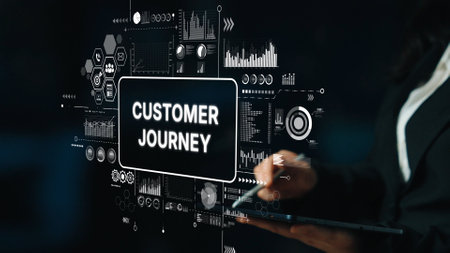 Businesswoman Engaging with Digital Interface Representing Customer Journey Analytics and Data Visualization Concepts. Asymptotic smart data analytic.