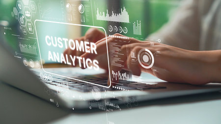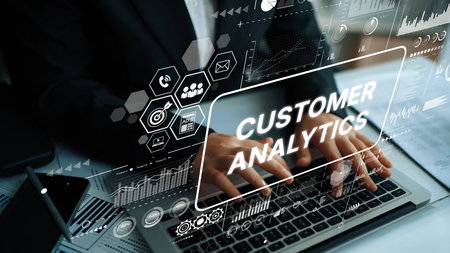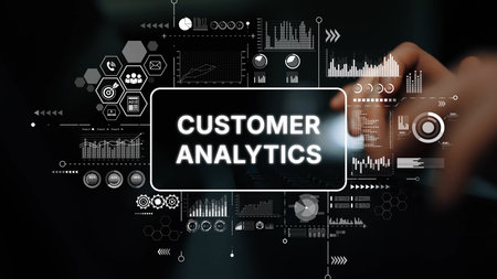 Business Professional Analyzing Customer Data with Digital Interface for Enhanced Decision Making and Insights Generation. Asymptotic smart data analytic.