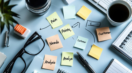 A desk with a coffee cup, a pen, and a bunch of sticky notes with words like pain, needs, customer, analysis, and points