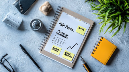 A notebook with a list of pain points for customer service. The notebook is on a table with pens and other office supplies