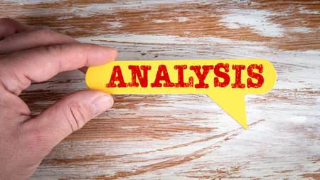 ANALYSIS. Yellow speech bubble in a mans hand on a white wooden background