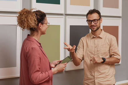 Young man talking to woman while she using tablet pc they standing against the pictures on the wall
