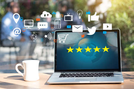 Customer review satisfaction feedback survey concept, User give rating to service experience on online application, Customer can evaluate quality of service leading to reputation ranking of business.