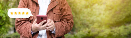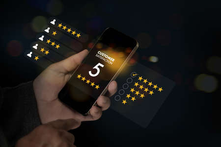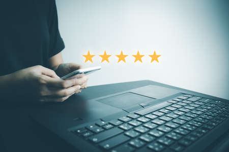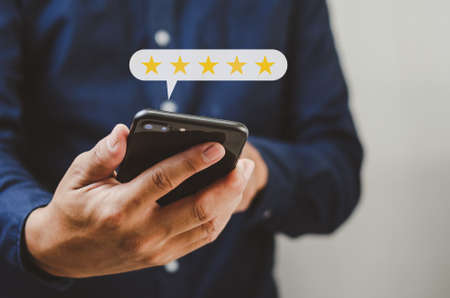Customer satisfaction concept. Hands of a business man using a smartphone to comment 5 stars. Excellent business rating experience. Satisfaction Rating, good and impressive