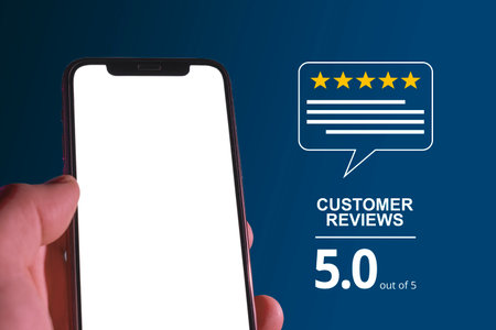 Customer reviews 5 Stars on toned blue background, with hand holding Smartphone with white screen. Review concept.