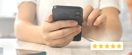 Customer review good rating banner concept, sutomer five star positive feedback icon, smartphone in woman hands