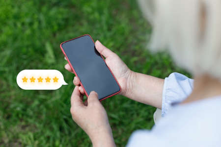 Person holding a smartphone with a screen showing 5 yellow stars, is reviewing a product through an online shopping application. Concept of using applications on smartphones via the Internet network.