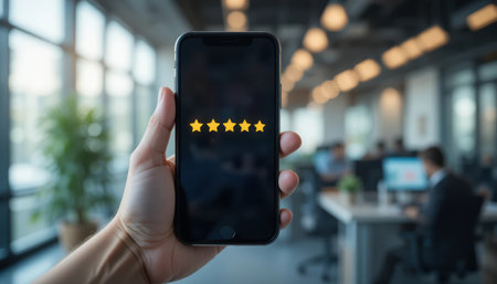 Closeup hand holding a smartphone. The phone's screen show a five star rating.
