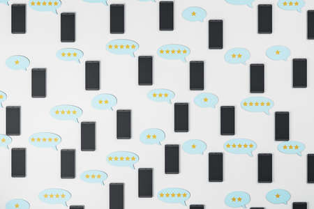 Social network icons of rating system with black cell phones on light surface. 3D rendering