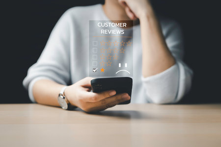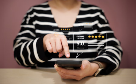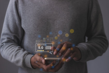 Satisfied customer experience concept, happy business customer using smartphone, the best review, High quality service, Most rated, the highest score, 5 stars, Social media very good.
