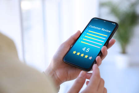Man using smart phone with 5 star rating on screen. Customer reviews concept.