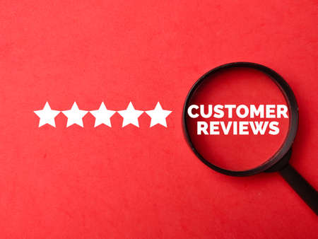 Top view magnifying glass with text CUSTOMER REVIEWS and star on red background.