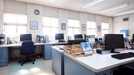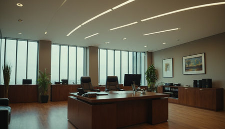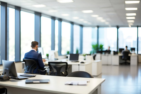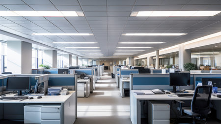 Embracing Productivity and Serenity: The Ideal Work Environment of Open Office Spaces with Desks, Computers, and Expansive Windows