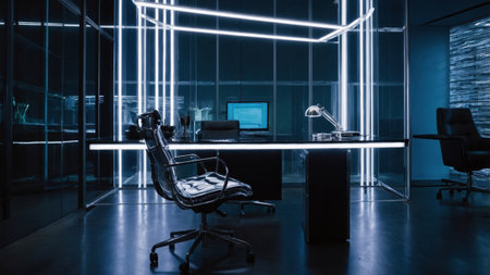 Tech-inspired workspace with glass desks, smart technology, and geometric lighting. Task lighting focuses on the desks, while LED strip lighting highlights the walls