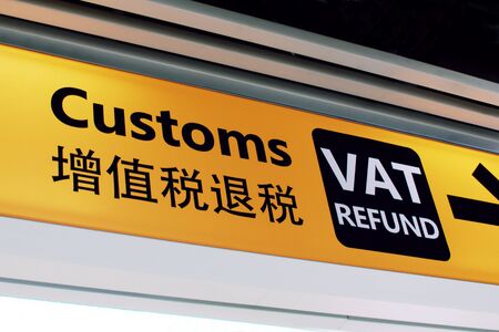Yellow customs office sign at an european airport, with text on english and chinese.