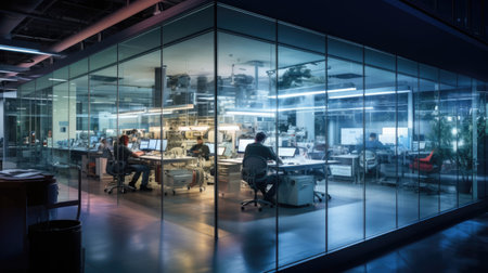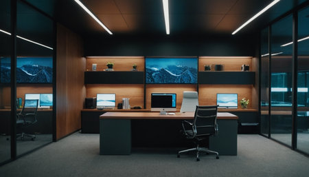 high-tech office space with modern desks, large monitors, glass partitions, and natural light
