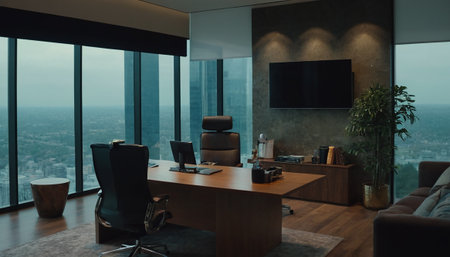 A serene modern office space at night featuring workstations, soft lighting, and greenery. This setting enhances productivity and calm in an urban environment.