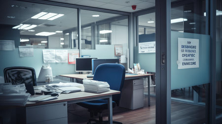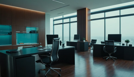 A modern office space at night with empty desks and chairs, large windows showing city lights, minimalistic design